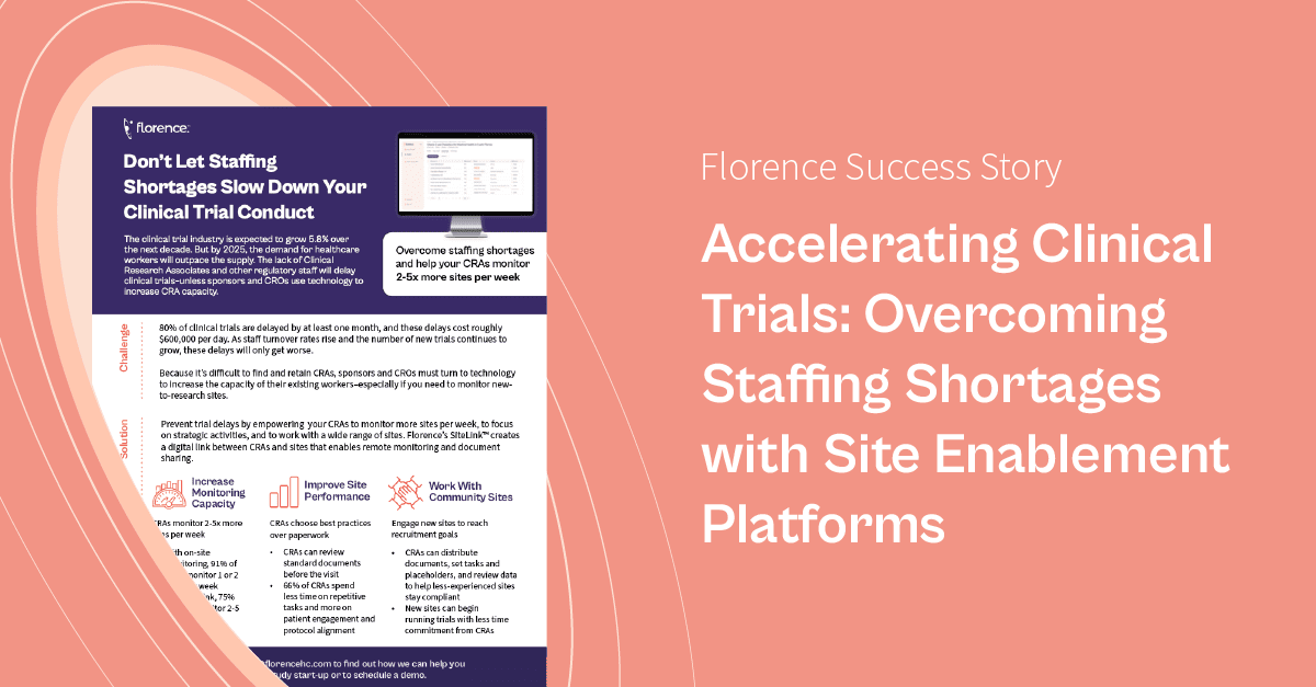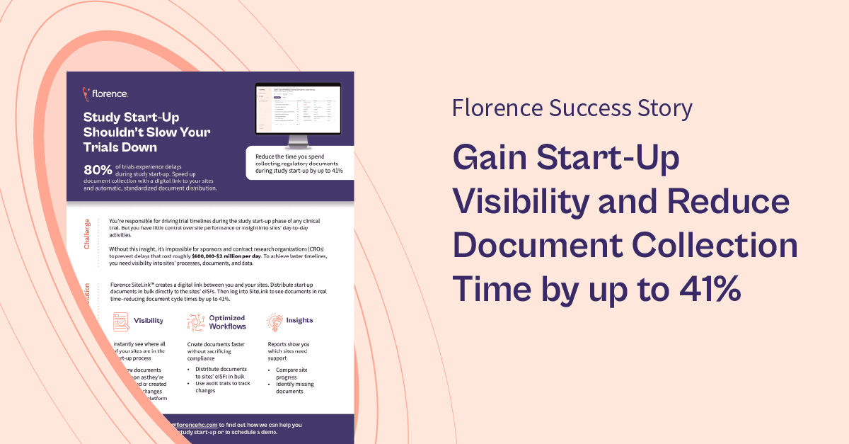How a Global Pharma Leader Used Florence’s SiteLink to Accelerate Study Timelines and Save Over 3,000 Hours of Administrative Work See how Florence can make your trials more efficient. Request Demo
